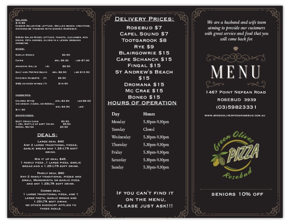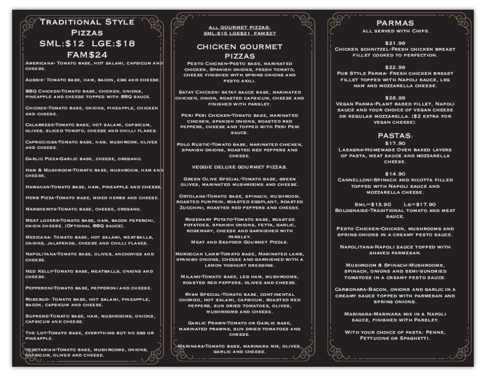The menu at Green Olives Pizza offers a wide variety of dishes perfect for any craving. For those in the mood for a fresh start, the Caesar Salad and Greek Salad offer light yet flavorful options. The dessert section features a classic treat with Ice Cream to satisfy your sweet tooth. Beverages include refreshing Soft Drink Cans and the larger 1.25l Bottle Of Soft Drink for sharing. The pizza selection caters to all tastes, with traditional favorites like BBQ Chicken and Chicken, as well as more robust options such as CalabreseCapricciosa and Garlic Pizza. Gourmet lovers can indulge in the Pesto Chicken, Satay Chicken, and Peri Peri Chicken pizzas, while veggie enthusiasts will enjoy the Green Olive Special, Ortolana, Rosemary Moroccan, and Milano varieties. The Parma choices include the hearty Chicken Schnitzel, the classic Pub Style Parma, and a unique Vegan Parma for plant-based diners. For sides and snacks, there's a variety of crowd-pleasers like Garlic Bread, Chips, Arancini Balls, Salt And Pepper Squid, and Chicken Nuggets, making it an ideal spot for both casual meals and satisfying bites. The menu truly offers something for everyone, with diverse options and an inviting atmosphere.